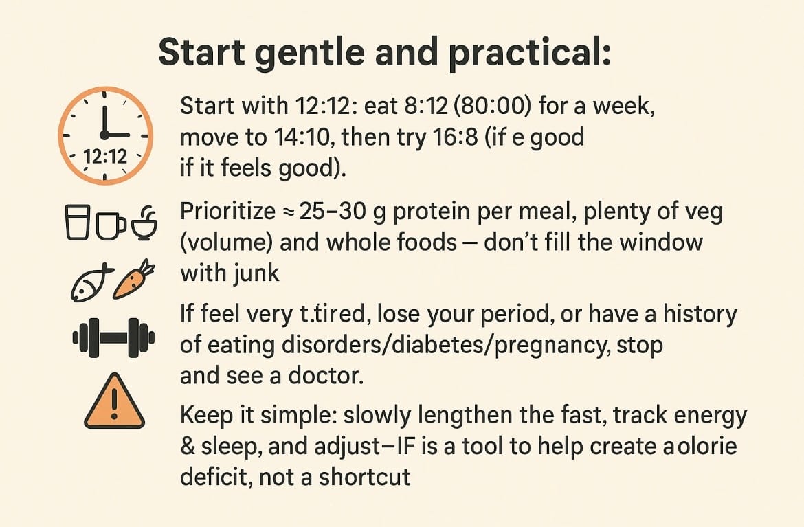 Keep it simple: slowly lengthen the fast, track energy & sleep, and adjust—IF is a tool to help create a calorie deficit, not a shortcut.