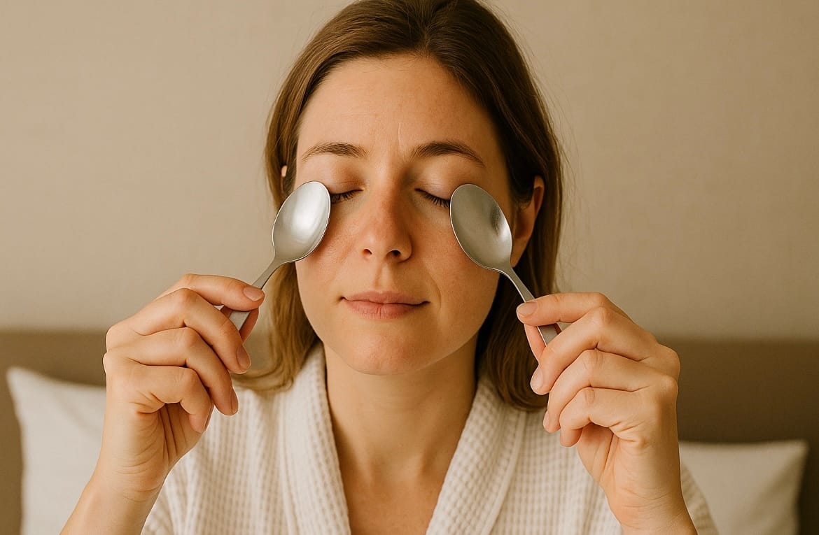 Hold two chilled spoons under your eyes for 2–3 minutes.